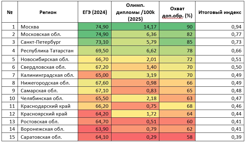 2. Московская область, Санкт-Петербург и Республика Татарстан показывают значительный рост благодаря целевым инвестициям в развитие образовательной инфраструктуры и региональных программ поддержки талантов. Московская область активно развивает образовательные кластеры в новых жилых комплексах, делает ставку на сильные физико-математические и лингвистические школы. Сила Санкт-Петербурга в его академическом фундаменте. Университеты (СПбГУ, ИТМО, Политех) тесно сотрудничают со школами, создавая систему непрерывного образования. Здесь сохранилась культура классического гимназического и лицейского образования, что дает блестящие результаты в гуманитарных науках и олимпиадном движении. Что касается Татарстана, то его успех – результат целенаправленной политики. Власти республики много лет делают ставку на образование как на ключевой ресурс развития. Строятся современные школы-центры, крупные компании (вроде «Татнефти» и «КАМАЗа») активно участвуют в подготовке будущих кадров, спонсируя классы и кружки.