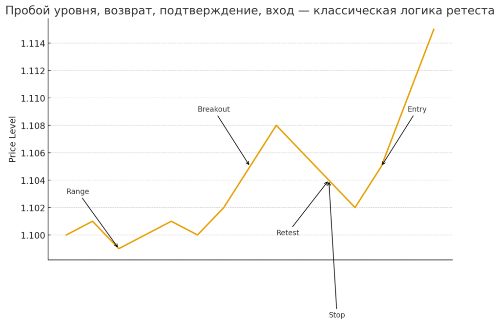Ретест — ключевой элемент стратегии. Рынок как бы проверяет, действительно ли эта зона теперь играет другую роль: бывшее сопротивление становится поддержкой, а бывшая поддержка — сопротивлением. Если при возврате цена не может закрепиться по другую сторону уровня и формирует разворотные свечи в сторону пробоя, это подтверждение смены режима.