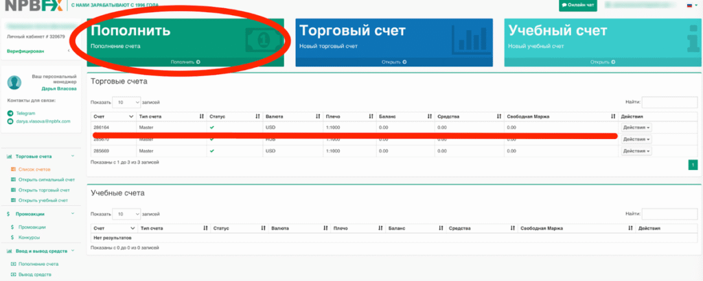 В личном кабинете NPBFX отображается всё, что нужно для работы: номер, валюта, тип счёта, плечо, баланс, свободная маржа.