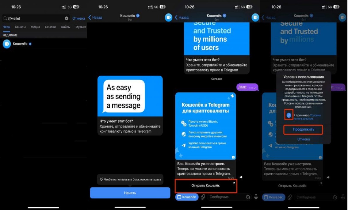 1. Для создания аккаунта в Кошельке (если у вас уже есть Кошелек в приложении Telegram – перейдите к разделу №2 этой инструкции) запустите приложение и следуйте пошаговым инструкциям на экране, как показано на скриншотах ниже. В строке поиска Telegram введите @wallet и выберите «Кошелёк». В открывшемся чате нажмите «Начать», «Открыть кошелёк», затем примите Условия использования и нажмите «Продолжить».