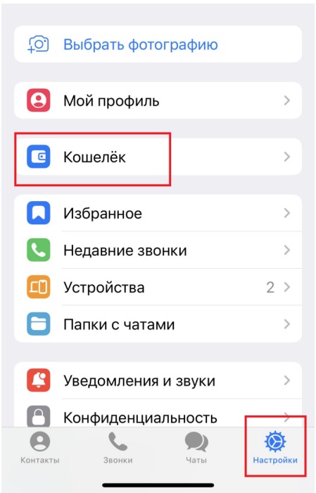 2. Зайдите в «Настройки» приложения Telegram и выберите «Кошелёк».