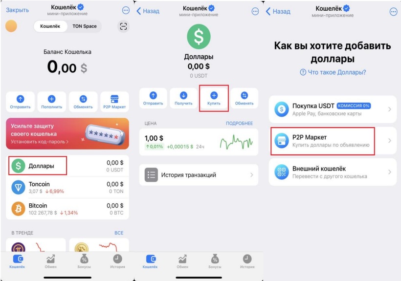 3. Далее для покупки USDT выберите в списке «Доллары» и нажмите «Купить». На открывшейся странице выберите «Р2Р Маркет»