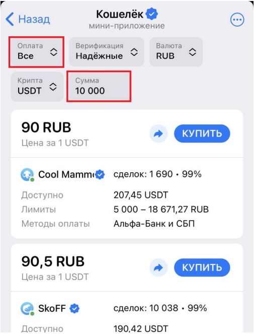 4. Далее настройте фильтры для покупки USDT, чтобы выбрать подходящее вам объявление. Для этого в поле «Оплата» выберите «СБП» для перевода рублей продавцу по Системе Быстрых Платежей, или название вашего банка для внутрибанковского перевода. В поле «Сумма» укажите вашу сумму в рублях. Остальные поля заполните, как показано на картинке ниже: в поле «Верификация» выберите «Надежный продавец», в поле «Валюта» выберите «RUB», в поле «Крипта» выберите «USDT». После установки фильтров выберите в списке подходящего продавца и нажмите «Купить». При выборе продавца обращайте внимание на курс, количество сделок и процент успешно завершенных сделок.