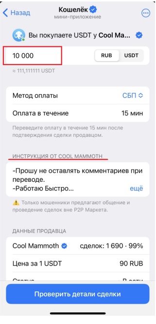5. После выбора продавца повторно укажите сумму покупки. Обращайте внимание на детали сделки, которые указаны в поле «Инструкция от продавца». Подтвердите сделку, нажав на «Проверить детали сделки».