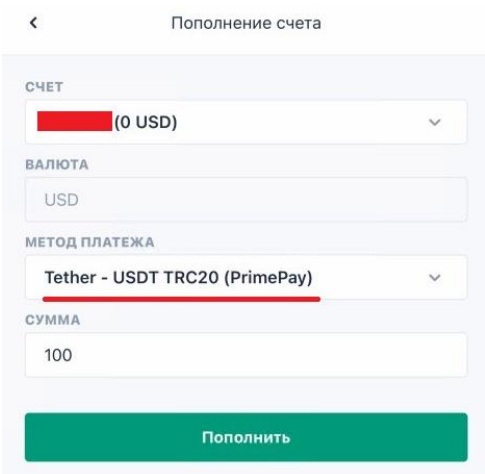 7. На странице пополнения торгового счета выберите торговый счет для пополнения, в качестве платежного метода – выберите Tether – USDT TRC20 (PrimePay), после чего укажите сумму перевода в валюте выбранного торгового счета и нажмите «Пополнить».