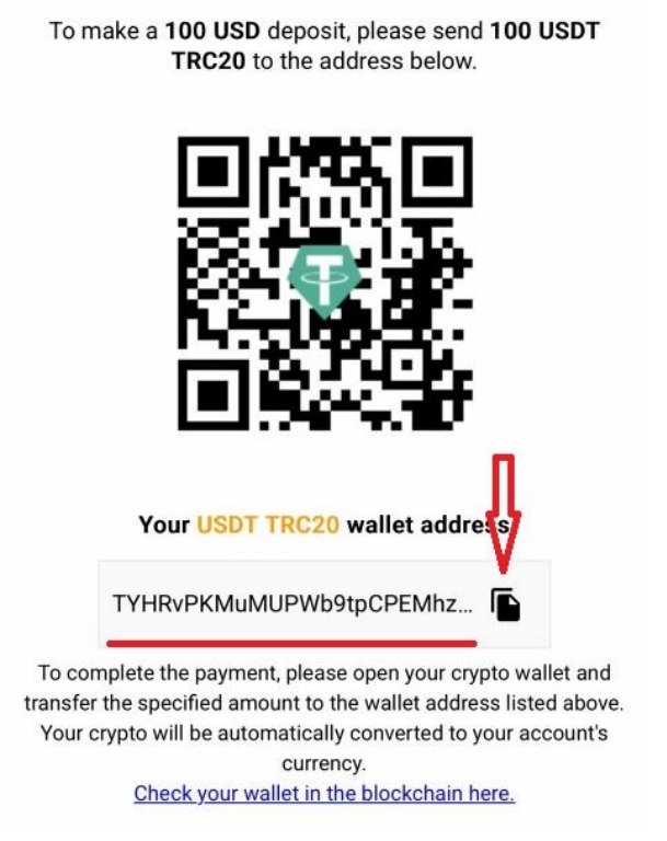 На открывшейся платежной странице будет предоставлен USDT TRC-20 крипто-адрес, на который необходимо совершить перевод средств. Скопируйте полученный адрес и вернитесь в Кошелек.