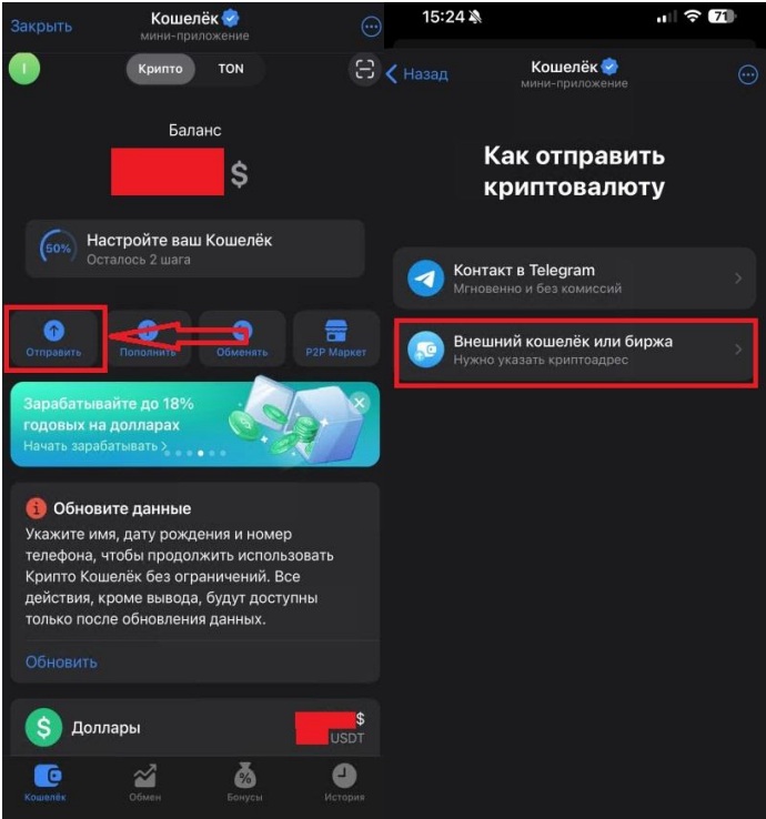 8. В Telegram Кошельке нажмите на кнопку «Отправить» и выберите опцию «Внешний кошелек». Здесь выберите валюту USDT, протокол TRC-20, вставьте скопированный ранее на странице пополнения счета крипто-адрес, после чего отправьте криптовалюту.